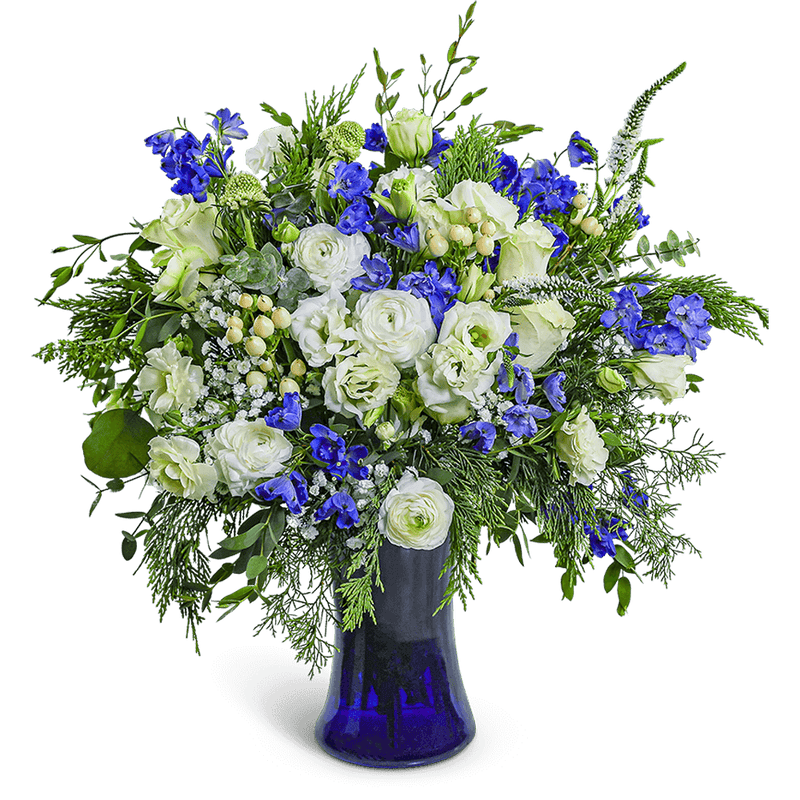 Blue Frost Snowfall is a serene winter arrangement featuring Roses, Lisianthus, Hypericum Berries, Scabiosa, Ranunculus, Veronica, Delphinium, and premium winter foliage. It would be perfect for any occasion and would look great on dining room table or kitchen island. Thoughtful substitutions may be made by our floral designer to maintain the overall look and feel.