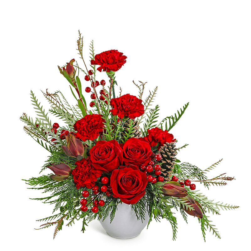 Crimson Radiance is a stunning winter arrangement featuring Roses, Carnations, Leucadendron, Pinecones, and premium winter foliage. Designed in a classic white vase, this design adds a bold and festive touch to any holiday setting. Our floral designer may make substitutions based on availability, always keeping the overall style and beauty of the arrangement intact.